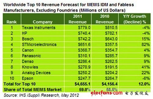排除了代工营收,IHS估计TI的2011年MEMS营收为7.79亿美元,其后依序为HP、Bosch、ST与Canon;总计全球前十大MEMS供应商2011年合併营收为47亿美元,较2010年的42亿美元成长12%。而曾经是摩托罗拉(Motorola)半导体部门的飞思卡尔(Freescale Semiconductor),在2011年跌出了前十大MEMS供应商排行,成为第十一名。