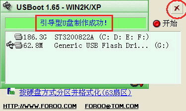 ⑧稍后就会出现下面这个成功的提示,说明你的U盘目前已经是可启动基本DOS的了,点击右上角的×关闭USBOOT。