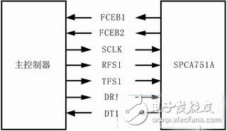 SPCA751A是单片的CMOS微处理器,是实时的MPEG音频解码和语音录音的专用芯片。主处理器通过串行控制口/I/O接口的命令控制SPCA751A对MPEG语音数据进行解码,主处理器也可以根据该接口检测解码过程。MPEG音频播放器系统框图如图3所示。SPCA751A与主控制器的连接如图4所示。