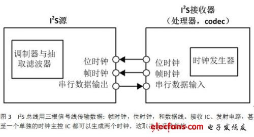 一个I2S总线会使用三根信号线做数据传输:帧时钟,位时钟,以及数据线。接收IC、发送IC,甚至一个单独的时钟主控IC都可以生成两个时钟,这取决于系统架构(图3)。带有I2S端口的集成电路通常可以设置为主模式或从模式。除非设计的信号链中使用了采样率转换器,否则系统通常会有单一的I2S主设备,以避免出现数据同步问题。