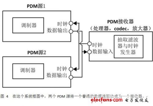 有了PDM,仅两根信号线就可以传输两个音频通道。如图4系统框图所示,两个PDM源将一根公共数据线驱动为一个接收器。系统主控生成一个可被两个从设备使用的时钟,这两个从设备交替使用时钟的边缘,通过一根公共信号线将其数据输出出去。
