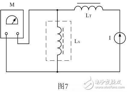 图7是采用电流迭加法测试开关变压器电感量或伏秒容量的工作原理图。图7中,M是电感测试仪,LT是隔离电感,I是电流源,Lx为待测开关变压器的初级电感。LT的电感量必须远远大于被测开关变压器初级线圈的电感量,如果电流源I是一个理想的恒流源,那么隔离电感LT可以省去。下面我们来介绍图7的工作原理。