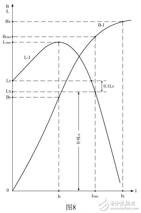 于此相对应,我们还定义:当流过开关变压器初级线圈的电流I,使开关变压器初级线圈的电感L下降到初始电感L0的90%时,此时流开关变压器线圈的电流,我们称之为极限电流Imax,对应开关变压器铁芯中的磁感应强度B,我们称之为极限磁感应强度Bmax。