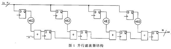 数字滤波器主要通过乘法器、加法器和移位寄存器实现。串行处理方式在阶数较大时,处理速度较慢。而现代数字信号处理要求能够快速、实时处理数据,并行处理数据能够提高信号处理能力,其结构如图1所示。