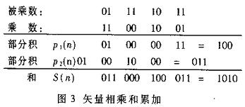 对于无符号数来说,这是一种理想结构。但是在实际使用中,通常使用有符号数且常用补码的形式,因此需要对这种结构进行改进。一种改进方法是将输入的数据分开,即最高的几位作为有符号数处理,其它作为无符号数处理。第二种改进方法是将符号数经过补码/原码变换器变换成原码,然后,将原码作为无符号数处理,通过有符号数的符号位来控制加法器的加减。第三种改进方法是一种优化方法,即要用三个二进制补码变换器,处理输入的有符号数和滤波器的系数,这样可以避免使用有符号数的乘法和加法运算。具体的乘法累加器运算过程及结果如图3所示。其中,对应乘数高位和低位部分积p1(n)和p2(2)可以分别先垂直相加后水平相加,或者先水平相加后垂直相加,最后的结果是一样的。若采用后种方法,由于FIR滤波器的h(n)均为常数,得到部分积的矢量乘法运算就演变成了查表法,其中,S1(n)表示S(n)的最低有效,p1表示最低有效位部分积之和。