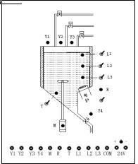按动启动按钮,电磁阀Y1闭合(Y1为ON),开始注入液体A ,当液面高度达到L3时(L3为ON)→ 关闭电磁阀Y1(Y1为OFF),液体A停止注入,同时,开启电磁阀门Y2(Y2为ON)注入液体B , 当液面升至L2时(L2为ON)→ 关闭电磁阀Y2(Y2为OFF),液体B停止注入,同时,开启电磁阀Y3(Y3为ON),注入液体C ,当液面升至L1时(L1为ON)→ 关闭电磁阀Y3(Y3为OFF),液体C停止注入,然后开启搅拌电动机M,搅拌10秒 → 停止搅拌 ,加热(启动电炉R)→ 当温度(检测器T动作)达到设定值时 → 停止加热(R为OFF),并放出混合液体(Y4为ON),至液体高度降为L3后,再经5秒延时,液体可以全部放完 → 停止放出(Y4为OFF)。液体混合过程结束。