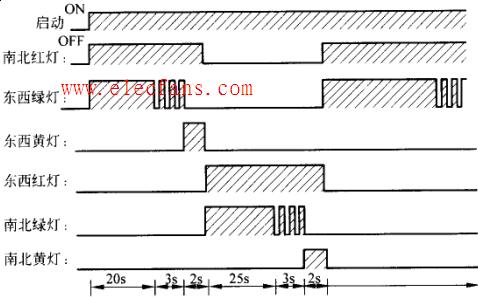 路口某方向绿灯显示(另一方向亮红灯)20秒后,绿灯以占空比为50%的一秒周期(0.5秒脉冲宽度)闪烁3次(另一方向亮红灯),然后变为黄灯亮2秒(另一方向红灯亮),如此循环工作。