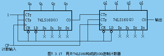 导读: 74LS160构成的100进制同步加法计数器由图可看出:低位片CT74LS160(1)在计到9以前,其进位输出CO=Q3Q0=0,高位片CT