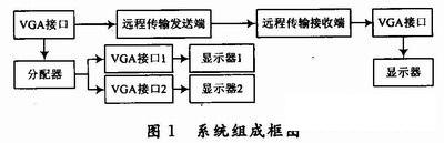 本系统设计包括两部分,一部分是视频信号的本地分配,实现1分2、1分4等;另一部分是视频信号的远程传输系统,远程传输系统又包括本地发送端和远程接收端。系统组成框图如图1所示。