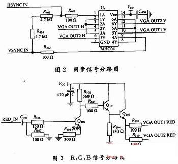水平、垂直同步信号HSYNC,VSYNC经过74HC04高速反相器后,输出波形得到整形,提高带负载的能力后,分别接至输出分路器1、2路的水平、垂直同步信号线上,实现VGA水平、垂直同步信号的1分2功能。同步信号分路如图2所示。