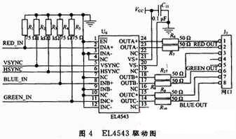 VGA信号远程传输中,由于传输导线的阻抗会引起信号的衰减,传输的距离越长衰减越大,从而造成信号不能正确读取。因此,VGA信号在远程传输的发送端需要将信号差分放大,以提高信号的传输能力。本系统发送端选用EL4543为差分放大器件。EL4543是Intersil公司生产的带同步编码的三路差分双绞线驱动器。EL4543是高带宽(350 MHz)的三路差动放大器,可对视频同步信号进行完整的编码,它的输入适合处理单端或差分形式的高速视频或其他通信信号。高带宽是标准双绞线或同轴电缆线上的差分信号,有非常低的谐波失真,同时,内部反馈保证输出有稳定的增益和相位,以减少辐射的电磁干扰和谐波。嵌入逻辑将标准的视频水平和垂直同步信号编码到双绞线的共模信号上,带同步信息的VGA输入RGB信号后与EL4543输入端上的75 Ω的终端电阻相连,单端的RGB信号被转换为差模信号,HSYNC和VSYNC在三个差动信号各自的共模信号上进行编码。EL4543的50 Ω终端输出驱动差分R,G,B,同步信号编码在CAT-5双绞线电缆的共模中。不带信号频率均衡的系统,可在200英尺的CAT-5双绞线上很好的传输。对于更长的电缆,在接收端用频率和增益均衡技术(EL9111)和延迟线技术(EL9115)来补偿信号的衰减,从而调整接收端的信号的相位不匹配。发送端EL4543驱动如图4所示。