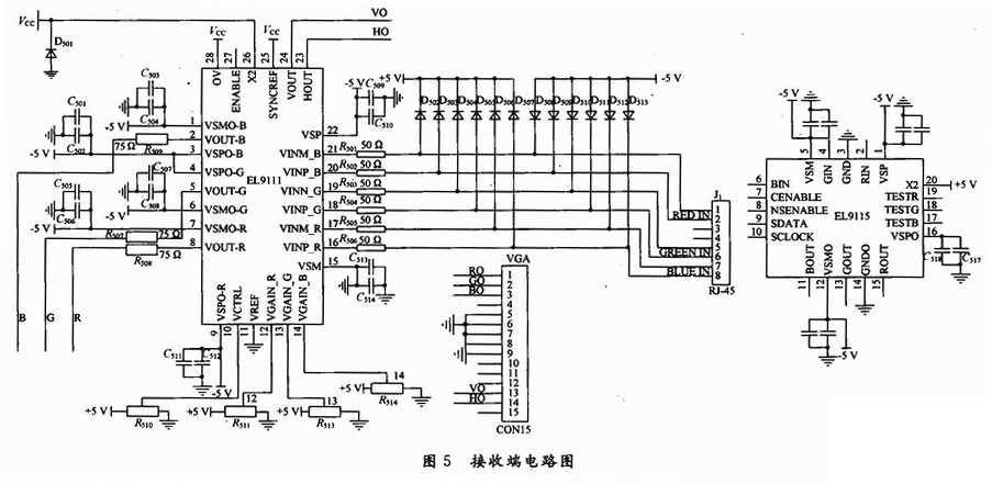 EL9111是三通道差分接收器和均衡器,含有三个高速差分接收器,具有5个可编程的电极。EL9111带宽为150 MHz,均衡长度由一个单独引脚上的电压设定。EL9111有两个逻辑输入引脚(ENBL)和开关增益(X2)。逻辑电路的逻辑基准管脚(VREF)的电势之上都有1.1V的额定门限。在多数应用中,芯片工作在+5 V,0 V,-5 V的供电系统中,逻辑值在0~+5 V之间。EL9111的特点是共模译码,可对水平和垂直方向上的信息进行译码,该信息由EL4543的三个差分输入端译码,因此仅用三对电缆,就可完整地传输RGB视频信号和相关的同步信息,如图5所示。