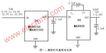 与基于电感的电压控制器相比,电荷泵具有小尺寸的优势,它被广泛用于便携式产品中,提供负的电源电压。将电荷泵电路与电压基准源相结合,能够在正电源供电时获得一反相基准电压(图一)。该电路不同于由三端基准和运放倒相器构成的反相基准源,它不需要外加精密电阻和负电源即可获得精密的输出。电荷泵倒相器(U2)将5V 精密基准源(U1)的输出反相,产生-5V基准电压。U1输入电压范围为5.2V至12.5V,如需获得-2.5V的基准电压,可用MAX6125(输入电压+2.7V至12.5V)替代U1。该方案电路结构非常紧凑,芯片采用SOT23封装,外部只需要三个标贴电容。