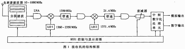 该接收机接收信号频率范围:10~100MHz,为防止频谱混叠,前端电调谐滤波器分8段滤波器,由8031控制选用。第一本振LO1采用数字锁相环产生所需频率,通过预置,可产生正弦信号频率范围:1360~2350MHz,步进值10Hz,电调谐滤波器与一本振互动联调。混频后,将信号通过一中心频率为1350MHz的带通滤波器后,进行二次混频。第二本振LO2产生信号的频率固定设置为:1371.4MHz,因此中频信号为:21.4MHz,通过AGC控制输出信号强度范围为:-50~-10dBm/50Ω。