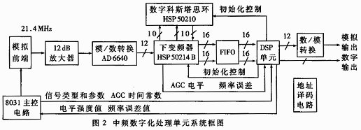 该单元是接收机的核心部件,主要完成几种信号(AM、FM、SSB、CW、FSK、BPSK,QPSK)的解调工作,同时负责对模拟前端提供AGC控制用电平强度值和AFC控制用载波频率误差值。8031主控电路板则要为中频数字化值单元提供:信号类型、中频带宽、AGC时间常数、BFO值、PSK信号波特率等控制命令。中频数字化处理单元硬件系统大体构成如图2所示[1]。