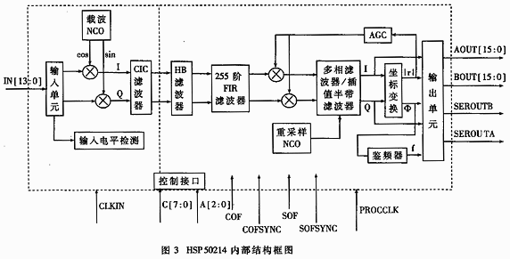 数字下变频单元由美国Harris生产的专用可编程下变频器HSP50214B和专用可编程数字科斯塔司环电路HSP50210构成。HSP50214B大体可分成13个部分[3](见图3),主要功能是将IF数据下变频成基带数据。其前端处理速度高达65Msps,后端处理速度最高达55Msps。总的抽取因子范围:4~16384,输出采亲速率可达12.94Msps,输出低通带宽最宽为982kHz(IF带宽1.96MHz)。最高支持14bits字长的数据并行输入,输出形式灵活多样,既可并行输出又可串行输出,既可选择直角坐标数据输出又能选择极从标数据输出,可选择输出幅度、瞬时相位和频率等参数。另外,HSP50214B还内带电平检测器,可为IF自动增益控制提供支持。总之,HSP50214B功能非常强大,使用相当灵活,可以解调AM、FM、FSK信号。与HSP50210一起使用,还可以解调SSB和PSK信号。