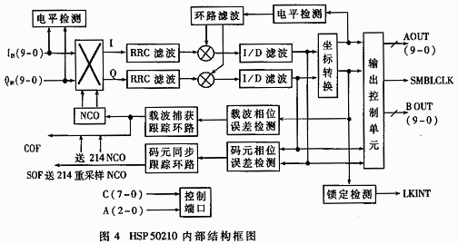 主要用HSP50210来提取相干载波、码元同步信号和载波跟踪情况指标。其内部的AGC环路、内部NCO载波跟踪、混频电路及RRC滤波器等均旁路不用。由于HSP50210需要HSP50214B提供两路正交数据,而其每一路数据长度只有10bits,因此要注意数据匹配问题。注意:载波跟踪误差COF利用同步信号COFSYNC串行送给214B的NCO,码元跟踪误差SOF利用同步信号SOFSYNC串行送给214B的重采样NCO,所以214B和210必须采用统一时钟才能保证同步传送数据不出问题。