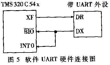 TMS320C54x只有高速同步串行通信接口,无法直接与8031进行异步通信。采用软件模拟UART方式较好地解决了这个问题[2]。该方法无需额外硬件开销,仅仅需要两个通用I/O脚(BIO和XF)、外部中断INT0以及一个定时器就可实现,硬件连接非常简单(见图5)。