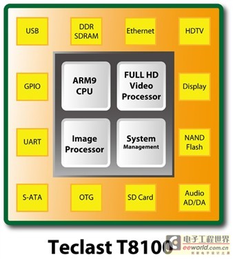 此外,T8100还支持JAVA硬件加速、DRM版权管理等多种特性,并支持LINUX、winCE等智能操作系统,可以轻而易举的打造出性能强大的MID设备。