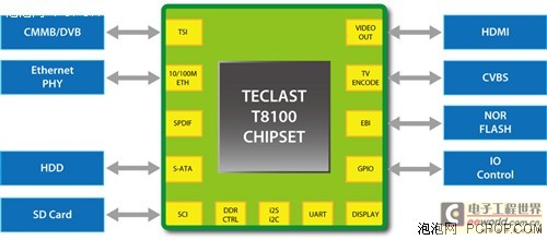 RV等,基本涵盖了目前网上能下载的所有视频编码,支持最高1920*1080p full hd流畅直播,可以说是一款全兼容、全格式、全高清主控芯片。T8100还内置多种画质优化技术,包括视频去噪、图像优化、反锯齿、伽马值修正、色彩还原等多种图像画质优化技术,视频输出品质极为优秀,可以到达全高清视频输出最高等级的画质要求。