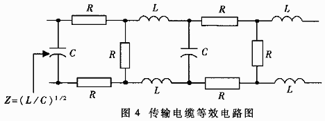 第二个影响信号传输的因素是信号在电缆的传输过程中衰减。一条传输电缆可以把它看出由分布电容、分布电感和电阻联合组成的等效电路,如图4所示。
