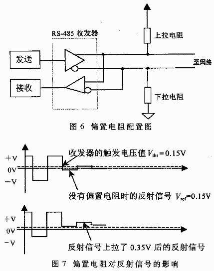 在通讯波特率比较高的时候,在线路上偏置电阻是很有必要的。偏置电阻的连接方法如图6。它的作用是在线路进入空闲状态后,把总线上没有数据时(空闲方式)的电平拉离0电平,如图7。这样一来,即使线路中出现了比较小的反射信号或干扰,挂接在总线上的数据接收器也不会由于这些信号的到来而产生误动作。