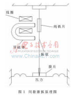 为了测量出振弦的固有频率,必须设法激发弦振动。激发弦振动的方式一般有2种:(1)连续激振方式。这种方式又分为电流法和电磁法,在电流法中,振弦作为振荡器的一部分,振弦中通过电流,所以必须考虑振弦与外壳的绝缘问题。若绝缘材料与振弦热膨胀系数差别大,则易产生温差,影响测量精度,连续激振容易使振弦疲劳。(2)间歇激振方式。如图1所示,振弦上装有一块小纯铁片,旁边放置电磁铁,当电磁铁线圈通入脉动电流i后,电磁铁的磁性大大增强,从而吸住小铁片(振弦);当线圈中无电流流过,电磁铁就释放振弦。如此循环激振,弦就产生振动。要维持弦持续振动,就应不断地激发振弦。即电磁铁每隔一定时间通过一次脉冲电流,使电磁铁定时地吸引振弦,故须在电磁铁的线圈通以一定周期的脉冲电流。当停止激振时,由于惯性的作用,振弦继续做阻尼振动,电磁铁线圈中产生感应电动势,感应电动势的频率与弦的阻尼振动频率相等。这样可由输出电势的频率测得振弦的固有振动频率。