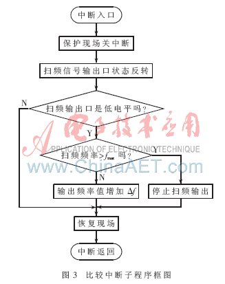 单片机PIC16F873A内带有捕捉/比较模块,用比较模式产生扫频信号十分方便。当要输出扫频激振信号时,首先使选择的通道号对应的MOSFET固态继电器导通,而使其他通道的MOSFET固态继电器截止处于高阻状态;其次,将捕捉/比较模块设置在比较模式下,把扫频信号频率的下限值fmin送到16 bit的比较数据寄存器中,清零定时器1的数据寄存器并启动定时器1开始定时计数。这时,比较数据寄存器中的值不断与定时器1数据寄存器的值比较,当两者相等时产生一个比较中断。在比较中断子程序中主要完成以下任务:(1)扫频信号输出口电平反转;(2)输出扫频信号的频率增加一个步距Δf;(3)将输出信号频率与扫频的上限频率值fmax比较,当扫频的频率值高于上限频率fmax时,停止扫频输出。用比较模式产生扫频信号的比较中断子程序框图如图3所示。