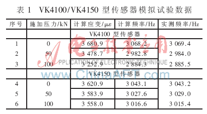 为了验证扫频激振电路的效果,选用美国基康公司的VK4100、VK4150型振弦传感器,在WE-30万能材料实验机上对振弦传感器进行模拟加载试验,其测试数据如表1所示。表中“计算应变”、“计算频率”是根据VK4100、VK4150的数学模型计算的值。通过对表1 数据的进一步分析可以看出,用该扫频激振方法不但对同一振弦传感器在不同受力状态时测频的相对误差小,而且对不同振弦传感器测频的相对误差也很小,实现了稳定的扫频和可靠的激振。从表中还可以看出,实际测量的频率值与理论值非常接近。