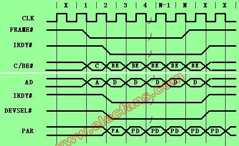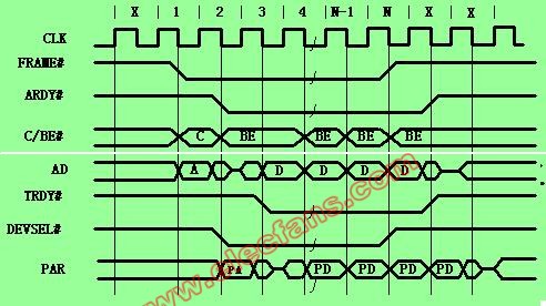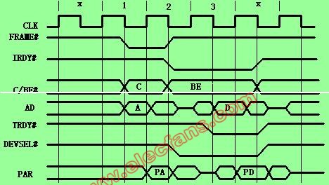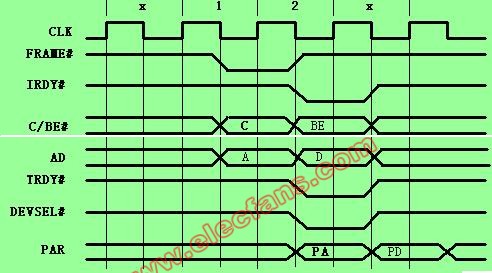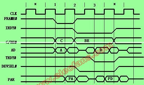 PCI总线对AD线的有效信息都进行奇偶校验操作。PAR为校验位,发送方为AD与C/BE#线(共36位)配好校验值。