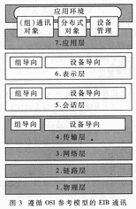 EIB通讯协议遵循OSI(开放式系统互联参考模型)模型,提供了OSI模型所定义的全部七层服务[6],这是其先进性之一。遵循OSI参考模型的EIB系统层次协议结构见图3。物理层和键路层明显依赖于物理媒质的特性,EIB通过优化防冲突规定了带有冲突检测的载波侦听多路存取(CSMA)以控制媒质接口;网络层通过网络协议控制信息(NPCI)控制跳跃擞;传输层的逻辑通讯关系包括一对多无连接(多终点组传输)、一对所有无连接(广播)、一对一无连接、一对一导向连接,它提供了地址与抽象内部表达之间的映射通讯访问标识等(cr-id);通过预留的会话层和表示层,所有设备被明显映射出来;应用层行使EIB网络用户/服务器管理的API(应用程序接口)功能,应用层对通讯对象组内部请求(或共享变量)分配通讯访问标识符,以完成收(一对多)和发(一对一)功能。