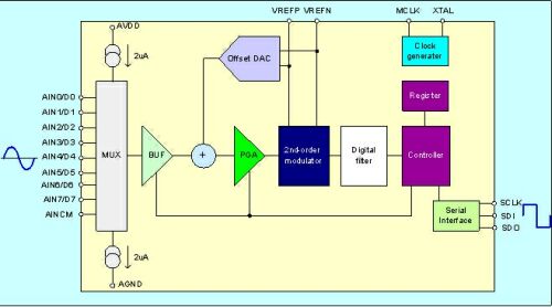 CS1240具有8个模拟输入端、8个数字输入输出通道, 可以选择输入通道模拟缓冲器或者直接将信号输入模数转换器,模拟缓冲器可以有效提高芯片的输入阻抗。芯片提供内部测试电流(2微安),可以检测输入端开路或短路情况。集成的8位数模转换器(DAC)可以通过寄存器控制来调节输入信号的偏置电压,有效扩大输入信号的范围,最大可以调整满幅度(FS)的50%。