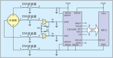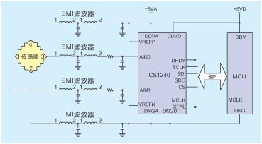 图3是采用CS1240实现的普通电子秤电路原理图。传感器出来的信号经过外部的无源滤波器滤波后,送入到CS1240中。滤波器包括两个部分:第一部分是由电感和电容组成的EMI滤波器,用来减小外部环境对于电路的影响;第二部分是由电阻和电容组成的RC滤波器,用来限制输入信号的带宽,降低输入信号的噪声。