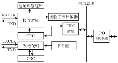 在图1中,接收逻辑在接收时钟的控制下,将串行数据拼成字节送到FIFO和CRC;发送逻辑将FIFO送来的字节在发送时钟的控制下逐步按位移出,并送到CRC;CRC逻辑在接收时对输入的数据进行CRC校验,将结果与帧尾的CRC比较,如不同,该帧数据将被拒收,在发送时CRC对帧数据产生CRC,并附加在数据尾传送;地址识别逻辑对接收帧的目的地址与预先设置的本地物理地址进行比较,如不同且不满足广播地址的设置要求,该帧数据将被拒收;FIFO逻辑对收发的数据作16个字节的缓冲,以减少对本地DMA请求的频率。