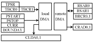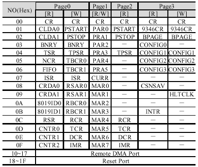 需要指明的一点是,RTL8019AS的DMA与平时所说的DMA有点不同。RTL8019AS的local DMA操作是由控制器本身完成的,而其remote DMA 并不是在无主处理器的参与下,数据能自动移到主处理器的内存中,它的操作机制是这样的:主处理器先赋值于romote DMA 的起始地址寄存器RSAR0、RSAR1和字节计数器RBCR0、RBCR1,然后在RTL8019AS的DMA I/O地址上读写指定地址上的数据。