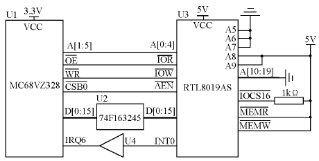 目前局域网常见的是采用双绞线为通信介质。图4为MOTOROLA的龙珠(Dragonball)处理器MC68VZ328(以下简称VZ328)和RTL8019AS的接口电路。RTL8019AS的工作电压为5V,而VZ328的工作电压为3.3V,所以RTL8019AS的输出需要电平的转换。在图4中,此电压的转换由U2 74F163245 完成。读数据时,D[0:15]数据经U2 送到VZ328;写数据时,D[0:15]送到RTL8019AS。 RTL8019AS在复位的上升沿锁定IOCS16脚的电平,其值决定数据总线的宽度:高电平时为16位总线方式,低电平时为8位总线方式。如挂接到8位主设备上,将以27kΩ的电阻下拉置地,D[8:15]空悬。为提高收发速度,图4采用16位数据总线方式。由于RTL8019AS没有外接初始化的EPROM,故其复位时命令寄存器(CR)的I/O地址的值为缺省值0X300,所以,为满足RTL8019AS的ISA时序,A5~A19的连接必须使其地址锁定在0X300,否则,就无法访问到RTL8019AS的寄存器。INT0中断脚经电平转换U4接到VZ328的IRQ6。VZ328以片选脚寻址RTL8019AS,接其端。在程序中,以I/O方式访问RTL8019AS,所以仅需要A[0:4]地址线,、接高电平关闭其MEMORY方式。