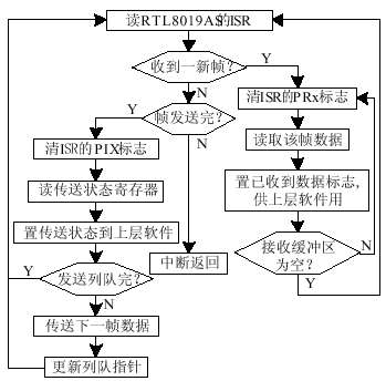 对RTL8019AS的软件操作,有查询和中断两种方式。在查询方式下,主程序通过CURR和Boundary两个寄存器的值来判断是否收到一帧数据。当Boundary与CURR不等时,说明接收缓冲区接收到了新的帧,主程序读取数据后,以读取帧的第二个字节(下一帧的页地址)更新Boundary,主程序循环跟踪CURR和Boundary达到数据的接收目的。主程序在发送一帧数据时,先要查TSR寄存器判断上一帧是否发送完毕。在实时多任务的环境,一般采用中断方式来处理RTL8019AS的收发。图5是一典型的中断处理程序(ISR)的流程。当主程序响应RTL8019AS的中断时,在ISR的入口,根据读取的中断状态寄存器(ISR)的值来确定程序的走向。