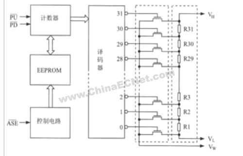 5位二进制加/减计数器计数达到一个极端时,不会循环回复,即当加计数时,不会由11111跳到00000;减计数时不会由00000跳到11111。控制电路负责控制5位e2prom,在计数器所计数据(滑动端的位置)的贮存和掉电后再次上电时,对e2prom存贮器所存数据操作调用。e2prom所存数据可保存100年。