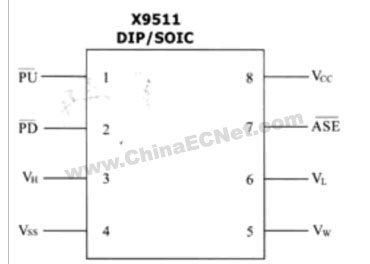 图2 x9511的管脚排列图 vh、vl:高电压端及低电压端,高、低电压端等效于一个机械电位器的两个固定端。