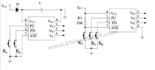 ase:自动贮存使能端,内部同样具有去抖动功能,如果从上电开始一直保持输入低电平,当芯片内部电路检测到vcc跌至4v时,便可开始将计数器的值(滑动端的位置)自动贮存到e2prom存贮器中,存贮时间至少需要2ms,在跌至3.5v之前必须存贮完毕。当电源恢复时存贮器的内容重新被调用。如果 ase脚保持输入高电平,则不执行自动贮存功能,只有将电平拉低后再恢复到高电平时,其电平的上升沿使其执行一次贮存指令。如果ase端在上电时保持高电平,而后再被拉低,则滑动端将不对pu和pd输入端作响应,直到ase再被拉高并保持为高。