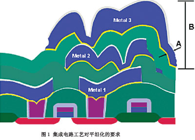 由于IC产业的快速发展,加上线宽的进一步缩小,使得晶片表面的高低起伏严重影响了制程技术的可靠性。以图1为例,由于表面层的高低起伏,所以我们每沉积一层薄膜,会使得表面的起伏变得更大,这种情况一直积累上去,到表面金属层时,在制程上会发生两个大问题:在镀上金属膜时,凹陷下去的部分和其它地方的厚度不均匀,如图中A处,此处不仅会引起电阻值增高,同时容易因为电子迁移而造成线路断路,造成元件具有很差的可靠性。另一方面,如果在这种凸凹不平的表面上涂覆光阻,在光阻显影时,会因为光阻深度不一,造成用来显影的光线在聚焦时,无法得到良好的解析度。通常线宽越窄,对解析度的要求越高,便需要提供愈短的距离来聚焦,这个距离称为聚焦深度,图中的B即代表此部分的元件的聚焦深度。