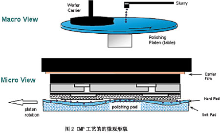 简单而言,CMP抛光工艺就是在无尘室的大气环境中,利用机械力对晶片表面作用,在表面薄膜层产生断裂腐蚀的动力,而这部分必须籍由研磨液中的化学物质通过反应来增加其蚀刻的效率。而研磨液、晶圆与研磨垫之间的相互作用,便是CMP中发生反应的焦点,如图2所示。CMP制程中最重要的两大组件便是浆料和研磨垫。浆料通常是将一些很细的氧化物粉末(粒径大约在50(m)分散在水溶液中而制成。研磨垫大多是使用发泡式的多孔聚亚安酯制成。在CMP制程中,我们先让浆料填充在研磨垫的空隙中,并提供了高转速的条件,让晶圆在高速旋转下和研磨垫与研磨液中的粉粒作用,同时控制下压的压力等其它参数。