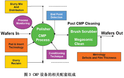 图3完整给出了CMP工艺相关的设备组成。可以看出,CMP的组成设备分为两部分,即研磨部分和清洗部分。研磨部分由四部分组成,即研磨液的引入和循环;研磨过程的监控;研磨耗材以及研磨运动组件。而清洗部分负责晶圆的清洗和甩干,做到“Dry in-Dry out”。