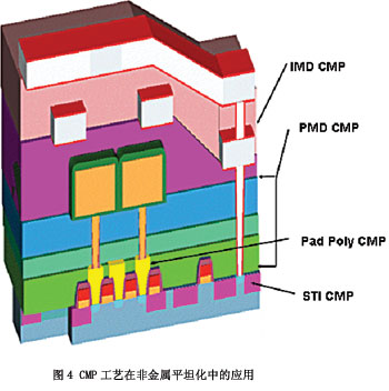 图4示出了CMP在集成电路制造工艺的非金属平坦化中应用,其中包括 STICMP, PolyCMP, PMDCMP 和IMDCMP。